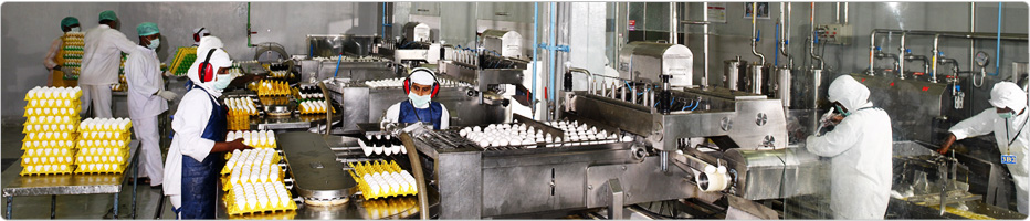 There are two product lines, one for yolk based products and another for egg albumen. The eggs are processed in a modern, fully automated factory using state-of-the-art equipments. The factory is fully air-conditioned and positive pressure is maintained in sterile zones. A fully automatic CIP system has been employed for cleaning the tanks and pipelines.